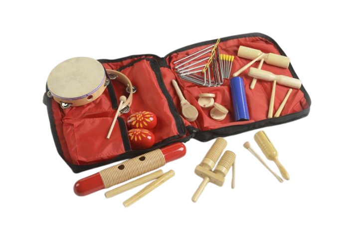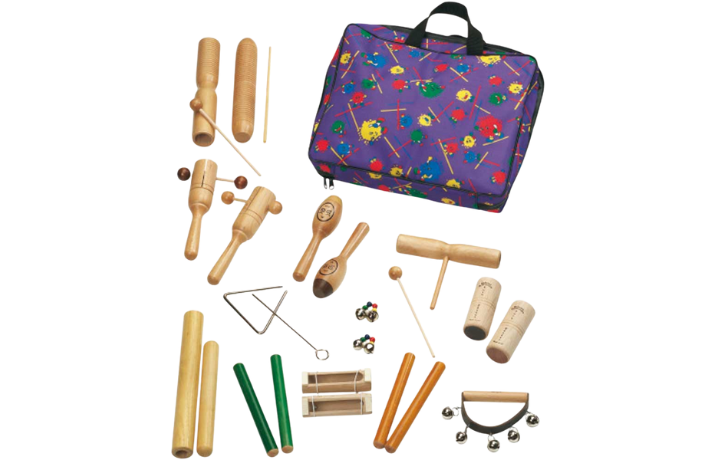 Komplekt sisaldab 37 osa: 1 trumminahaga tamburiin, 1 nahata tamburiin, 1 guiro, 1 kaksikguiro Agogo, 1 šeiker, 2 marakat, 1 käepidemega kõlatoru, 2 kahe helikõrgusega kõlatoru, 1 paar kastanjette, 1 tk käepidemega kastanjetid, 1 paar kõlapulki, 5 trianglit riputusnööride ja metallpulkadega, 3 puust pulka, 4 puust nuia ja must kott.