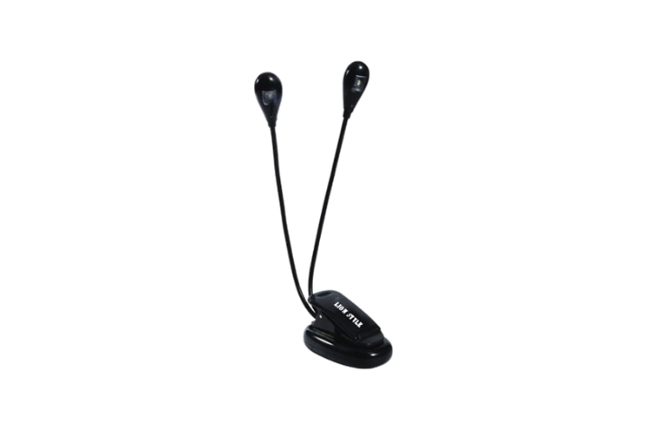 Näpitskinnitusega ja kahe painduva jalaga lamp, töötab nii patareidega kui USB-toitega. Kaasas 3 AAA-patareid ja USB-juhe.